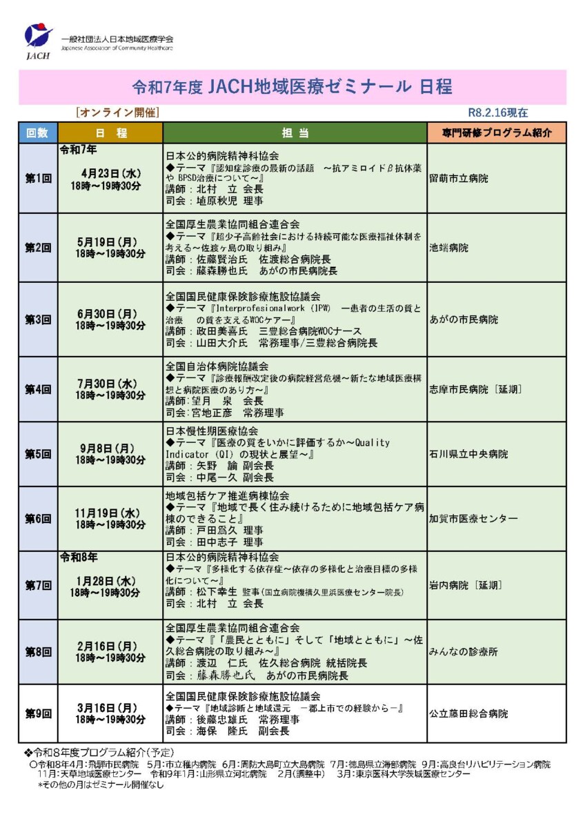 このゼミナールでは日本地域医療学会構成6団体から著名な講師陣が出演して講演を行っております。
